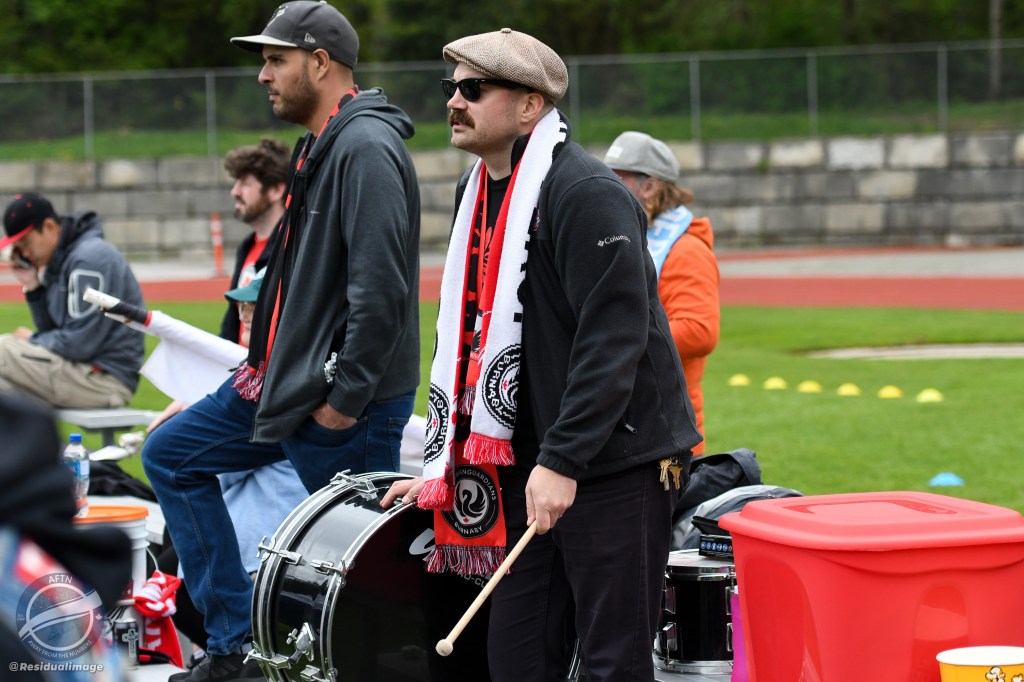 The weather began to shift slightly as the men’s side took the field, the sun fighting the clouds to make an appearance. It was a gritty start to this match as well. Rovers, once again in all black, had most of the possession. The first scoring opportunity came 15 minutes in when Connor MacMillan made a nice pass into the box for Ivan Meija, but the shot was blocked. Rovers’ number 17, Danylo Smychenko, made a couple nice tackles and followed up with a display of raw emotion, something always appreciated by the home crowd. Meija, number 8 for the Rovers, had a chance soon after, and the Highlanders goalie laid out for the save, but the ball was blocked and cleared to safety before it could reach the net. Midfielder Erik Edwardson then had a nice run towards the box with some pace before being taken down; the support again cried desperately for a call from the ref, but it did not come. Justyn Sandhu, the Rovers’ keeper, was soon called into duty for the first time, laying out for the ball before any Highlander players could take control in the box – a Victoria attacker went flying as Sandhu got his paws on the ball. The first legitimate chance for the opposition came in the 26th minute: a nice pass cut across the box, and it looked like there might be a tap-in goal, but the Rovers’ D scrambled to recover the ball and cleared for a corner. Brief respite. Then came another good clearance, this time a header, and danger was averted once more. Now on the attack, the Rovers’ Matteo Polisi sent a fantastic through ball down the line on the left, but the resulting cross was a poor one. A shot on target for Rovers came as the clock ticked into the 34th minute of the match, the result of a set piece from just outside the right of the 18-yard box. A nice, low cross came in and met a Rovers head, but the ball was sent right into the keeper’s hands. Victoria responded with a chance of their own, a longer range shot that stayed on the ground past the left post and out. The back-and-forth action continued. A rip from Rovers came flying off the left, the ball singeing the crossbar as it soared out of play. The intense, physical battle ramped up from there as a couple of hard tackles went uncalled. Shoves were thrown as the ball rolled out for a throw. “The movement is great, final third is what’s missing,” said part-owner and supporter Chris Corrigan, an effective summary of the women’s game earlier as well. More strong passing was displayed by the Rovers but nothing fruitful came of it, unfortunately. Yet another collision occurred in the Rovers’ box between a Highlanders attacker and our keep, Justyn, who did enough to block the shot. The rebound was sent an inch wide of the post, and Rovers were a bit lucky to escape the pressure. The whistle then blew, and we headed into the break still searching for our first tally.