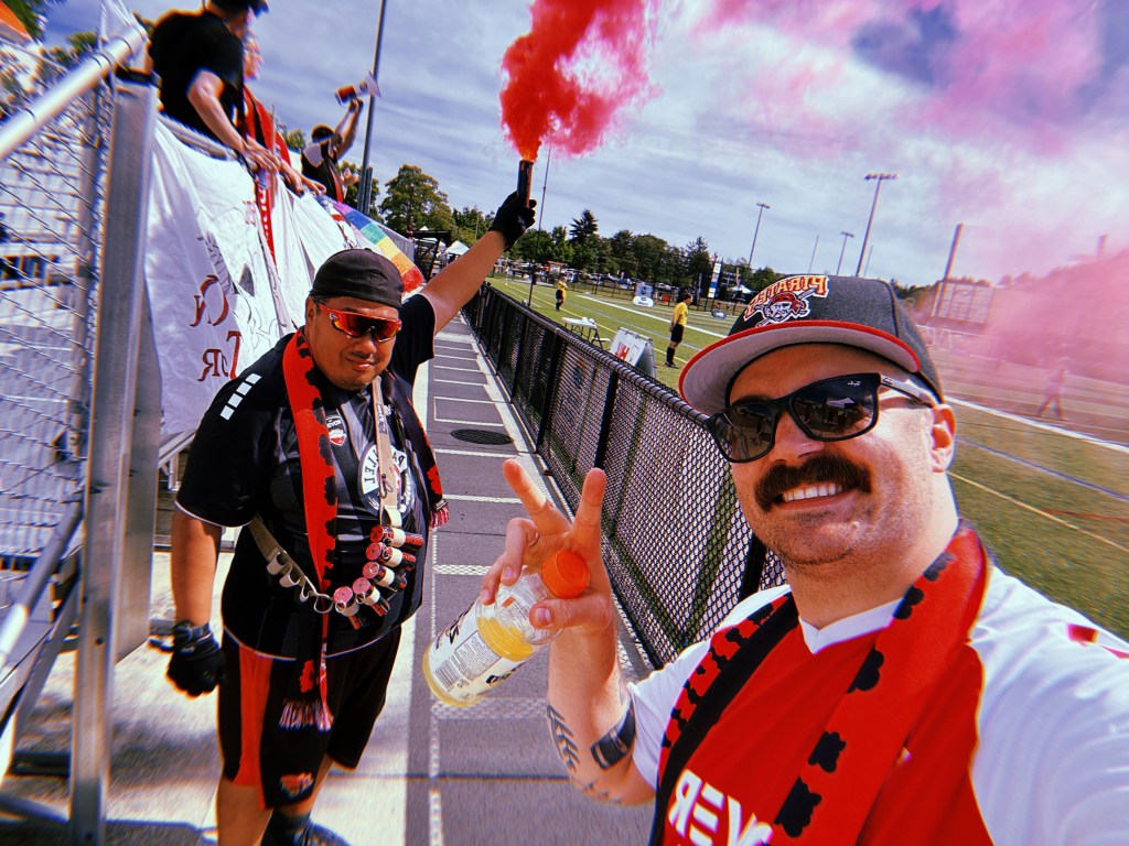 The men took the field first this time, switching up the normal order of events, which was a fun departure. Harbourside also held a sweet little ceremony for us Swaguardians just before kick-off, bringing some of the travelling support onto the pitch to acknowledge our first trip to Q’unq’inuqwstuxw Stadium and our work towards growing supporter culture in this league. Props to HFC, it was a nice touch! Rovers continued the celebration, scoring early on, six minutes in. The play developed quickly; a lofted pass flew forward over everyone, right onto the foot of Kian Proctor, who merely had to lift up his leg to make contact and volley the ball into the net. Luckily our smoke supervisor is always ready and waiting with his ammo – he promptly pulled a pin and a fluffy red cloud emerged, giving the home crowd a taste of what they were in for. HFC scored the next two, however, which provided the few home fans lining the top of the main stand something to razz us about. They popped one in from close range in the 22nd, and the second came just ten minutes later, a goalazo from exactly 30 yards out (thanks, handegg lines). We hit halftime faced with a deficit, an unusual situation for the Rovers’ men, who are used to being in command. No matter, we know this team is capable of a quick-strike turnaround. Right on cue, Rovers tallied back-to-back goals early in the second half; Kian got his brace in the 57th minute, claiming the ball in the box from another long aerial pass and sending a short rocket off the crossbar and in. A mere four minutes later forward Massud Habibullah was tripped up in the box, going to ground and winning a penalty kick for Rovers. Massud, keen to continue his scoring ways, took it himself, sending a low dart to the bottom right corner of the net, just out of reach of the keeper’s diving hands. 3-2 Rovers – it was a lead they would not relinquish, despite nearly eight full minutes of stoppage time.