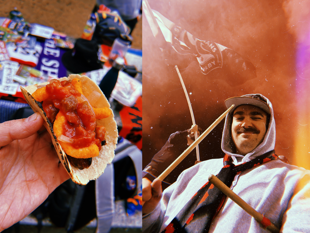 There wasn’t long to dwell on change as routine soon took over. As always before every home match, we gathered for a pre-game “tailgate” in the Central Park woodlands just beyond the stadium. It was lovely to see everyone circled around a picnic table full of snacks, loot, and a janky BBQ again after so long. There were even some great Rovers programs from years past, a mini archive to peruse. Then Global TV showed up; change pushed back against routine as a man with a video camera documented and inquired about our warm-up soirée. Was I filmed and interviewed while showcasing our MacGyver lunch special of the week, a breakfast-sausage taco on a toasted corn soft shell with pickled onions, Cheetos, salsa and Franks RedHot? Oh yes. “If you can’t win on the pitch, at least win off it,” was my impromptu line before digging into some groundbreaking gameday fare. Were we also asked to sing in the woods, which we never do, and to use a broken branch in place drumstick. Yes, indeed. Was it all odd but also fun? Yes and yes again.
